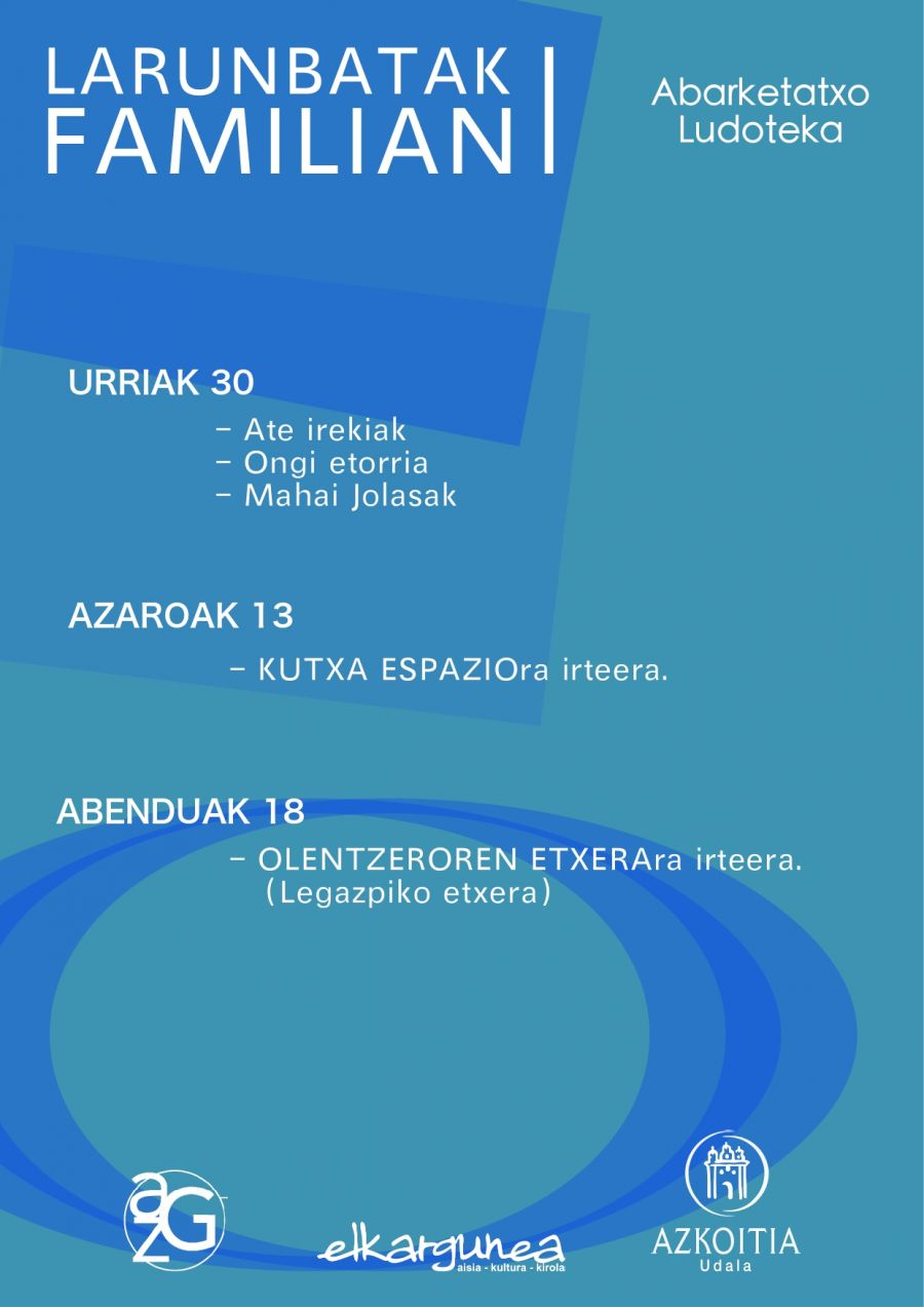 Urritik martxora bitartean, hilean behin zapatu bat, eskainiko zaio familia osoari, haurrek gurasoekin etortzeko aukera izango dute. Lehen hiruhila honetan, urriak 30, azaorak 13 eta abenduak 18 izango dira. Ekintzetan izena emateko ludotekan egin beharko da.