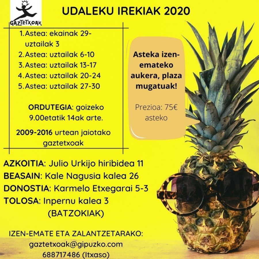 Gaztetxoak elkarteak, ekainaren 29tik uztailaren 30a bitartean Udaleku irekiak antolatu ditu Azkoitian lehen aldiz. Asteko txandak izango dira, goizez, 9:30-13:30eak bitartean. Txanda bakoitzak 75€ko kostua izango du. Interesatuak izena emateko eta zalantzak argitzeko 688.717.486. Itxasotaz galdetuz argitzeko aukera izango duzue, edo Helbide elektroniko hau spambot-etatik babestuta dago. JavaScript gaituta izan behar duzu ikusi ahal izateko. helbidera mezua bidali.