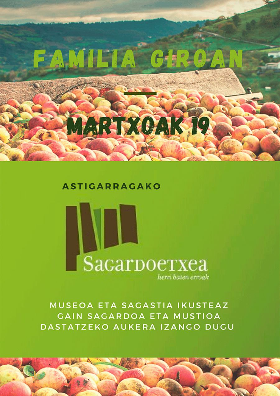 Astigarragako Sagardoetxera joango gara, martxoaren 19ean, larunbata. Izen ematea; otsailaren 28etik martxoaren 4ra izango da ludoteka bertan. Helduak 4,5 euro izango da eta haurrena 3€.