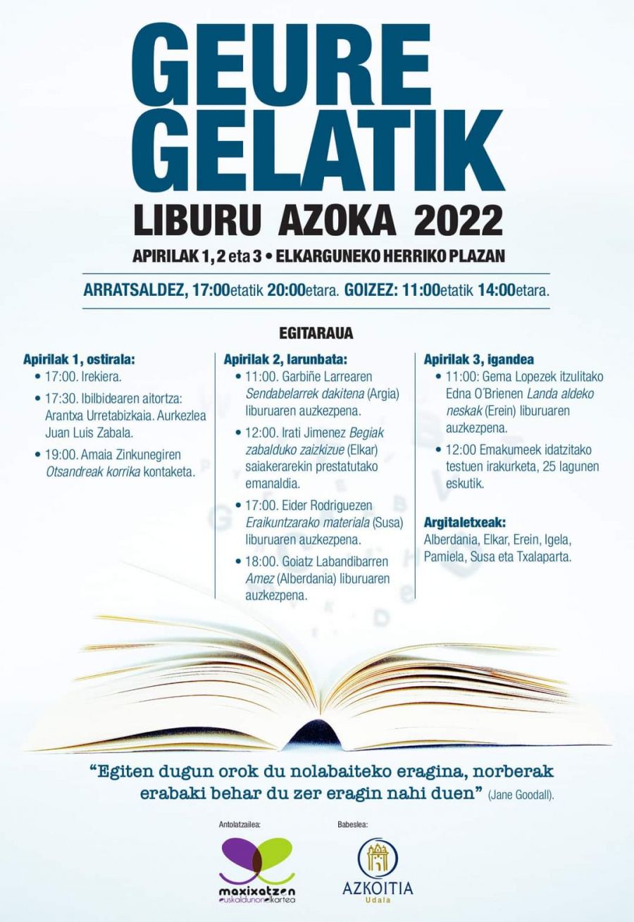 Apirilaren 1etik 3ra bitartean, Elkargunean, herriko plaza aretoan gauzatuko da. Bertan liburu aurkezpen ugari eta irakurtzeko aukera bikainak ikusteko eta erosteko aukera izango da. Azokak Virginia Woolf idazle aintzindariari keinua egingo zaioa EGITARAU oparo bat eskainiz.