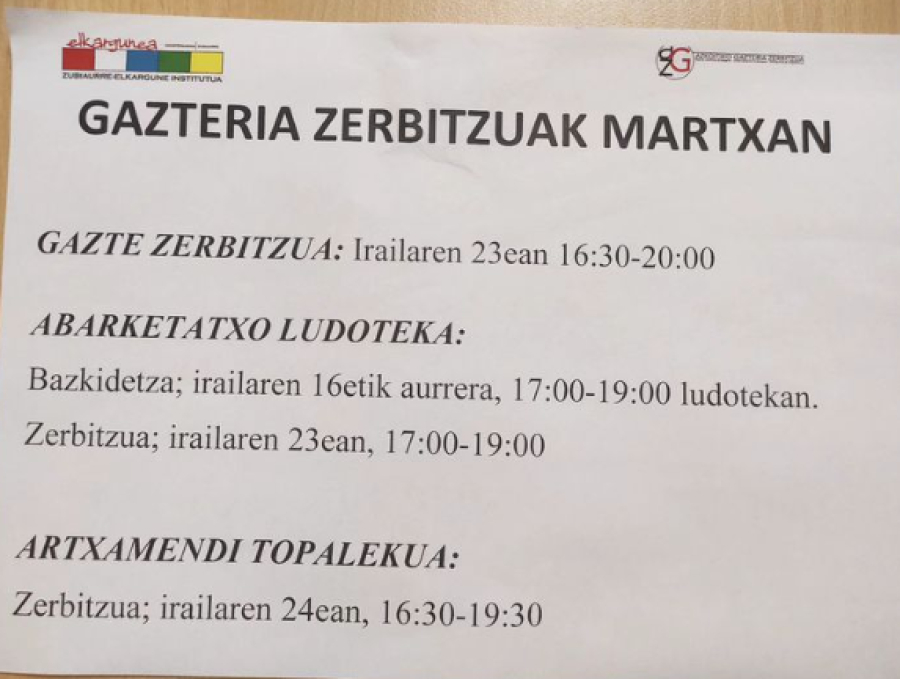 Udalaren zerbitzu hau zuretzako espreski zuzenduta dago. Nerabe, gazte, familia, eta elkartea bazara, zure interes eta beharren araberako informazio osoa, garbia, zehatza, gaurkotua, inpartziala eta doakoa izango duzu gaia edozein dela ere: lana, bekak, bidaiak, txartelak, festak, elkartrukeak, Europa, ikastaroak, etab. Astegunetan irekita dago, 16:30etatik 20:00etara eta ostirala goizetan 9:30etatik 12:00etara.