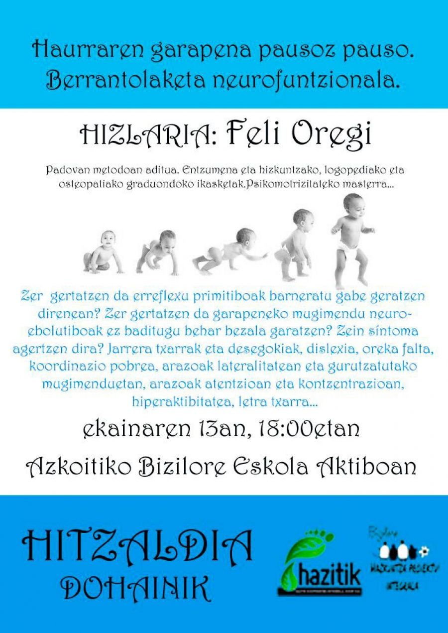 "HAURRAREN GARAPENA PAUSOZ PAUSO. bERRANTOLAKETA NEUROFUNTZIONALA" hitzaldia, Felii Oregin ezkutik, ekainaren 13ean, asteartean, 18:00etan Azkoitiko Bizilore Eskola Aktiboan.