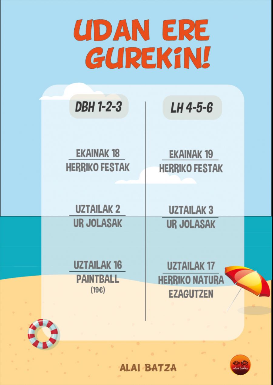 Ikasturtean zehar Alaibatzan ibili diren haur eta nerabeentzat udako ekintza berezi batzuk prestatu dituzte Alaibatzan, UDAN ERE GUREKIN egitasmoan barne. Izena ematea irekita dago EKAINAREN 4a arte. Ekintzen aukerak hemen adinez adin