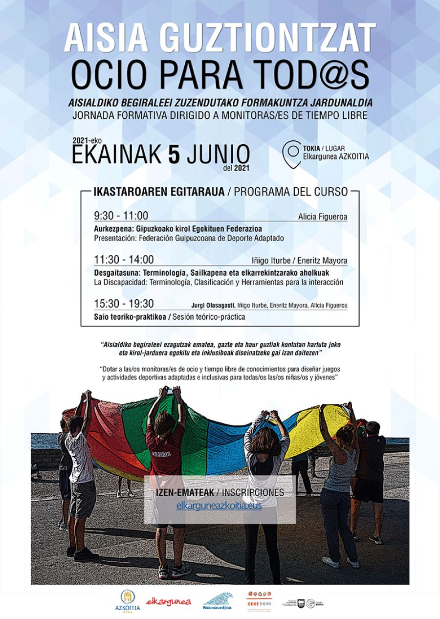Aisialdiko begiraleei zuzendutako formakuntza jardunaldia, ekainaren 5ean, goizeko 9:30etatik 14:00etara eta 15:30etatik 19:30etara, Elkargunean. Izen ematea egitea beharrezkoa da honako loturan.