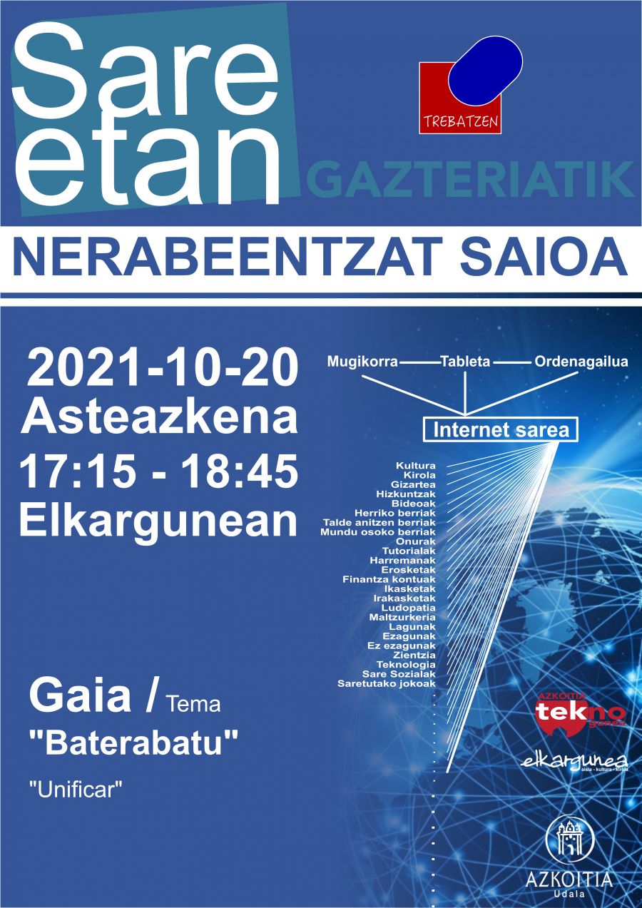 - Familientzat saioa; urriaren 21ean, osteguna 15:15 - 16;45era, Elkargunean. Gaia; NERABEZAROA KONEKTATURIK".