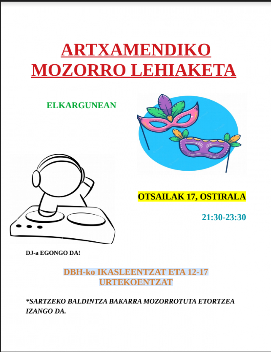 Aurten ere inauterietan Artxamendiko mozorro lehiaketa egingo da 12-17 bitarteko gaztetxoentzat. Otsailak 17, 21:30- 23:30 bitartean.