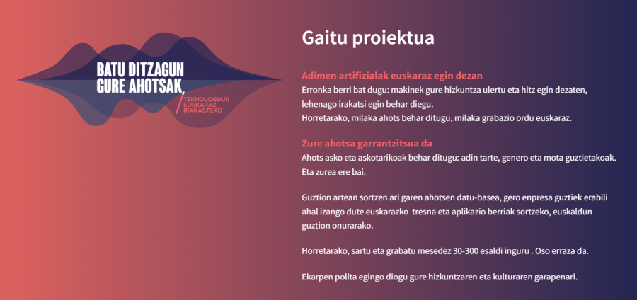Inteligentzia Artifizialak euskaraz ahotsak behar ditu.Makinak gure hizkuntza ezagutu dezan eta GAITU.EUSen proposamen bat dago.