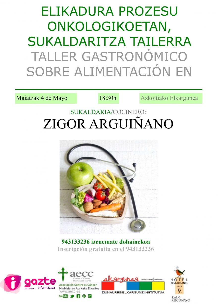 Elikaduran prozesu onkologikoetan duen eragina ikusi eta ikasteko sukaldaritza tailerra izango dugu, ZIGOR ARGIÑANO sukaldariaren eskutik, maitzaren 4ean, osteguna, arratsaldeko 18:30ean, Elkargunen. Izen ematea 943133236 tfnoan egin beharko da. Doan.