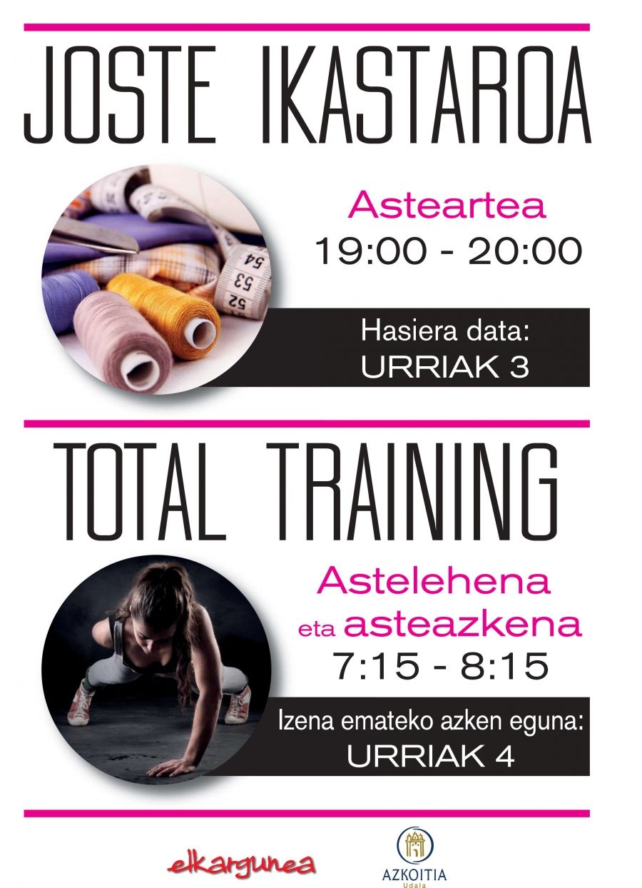 JOSTE ikastaroa eta TOTAL TRAINING ikastaroa. Izen emateak Elkargunen, 943.85.25.44.