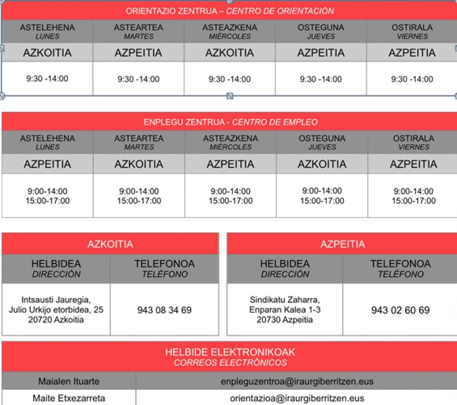 Enplegu Zerbitzua; astearte eta ostegunetan 9:30-14:00 eta 15:00-17:00