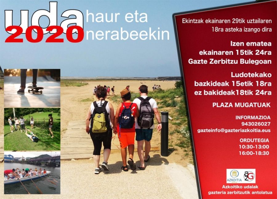 COVID-19a dela eta udalekuak bere hortan egitea utzi ondoren, Azkoitiko Udaleko Gazteria Zerbitzuetatik ahalegin berezia eginez, haur eta nerabeei zuzendutako ekintza bereziak antolatu ditugu. Ekintzak ekainaren 29etik uztailaren 18ra garatuko dira, asteka, ekintza bereziak goiz edo/eta arratsaldez garatuz.